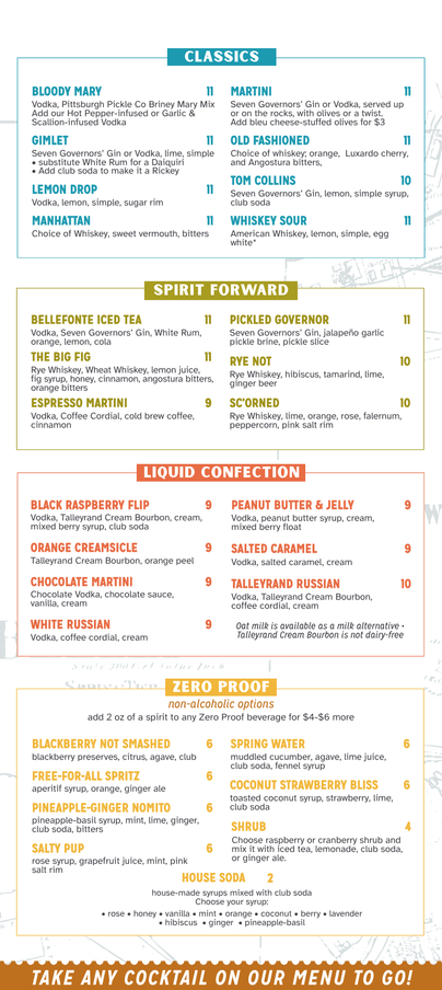 With views overlooking beautiful Talleyrand Park, our Tasting Room is the perfect place to grab one of our signature craft cocktails and relax in an intimate and hip atmosphere. Crafted by our award-winning bartenders, our cocktail menu is seasonally inspired and features classics, as well new creations inspired by local and seasonal ingredients. Whether you choose our take on the classic cosmopolitan - the Centrepolitan, or the crowd favorite Coaly, aka the Milesburg Mule, you can’t go wrong! Scroll down to take a look at our current Tasting Room menus.